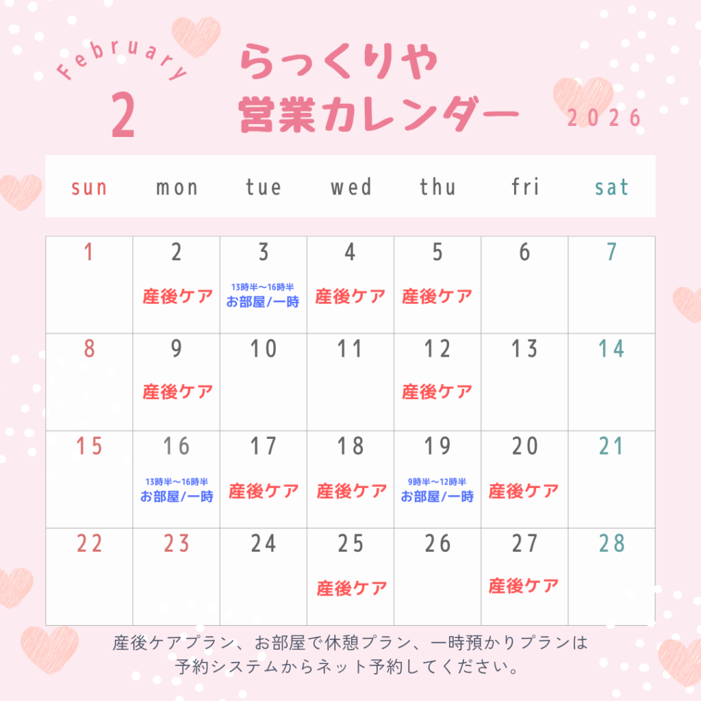 ホームお知らせ 2月のサービス予約開始しました! 2026年1月21日 2月の営業カレンダーをお知らせします。 産後ケアプラン、お部屋で休憩プラン、一時預かりプランのご予約は下のボタンからよろしくお願いいたします。 ご予約はこちらから くわしいサービス内容については「サービス内容」のページをご覧ください。 ご利用お待ちしています!