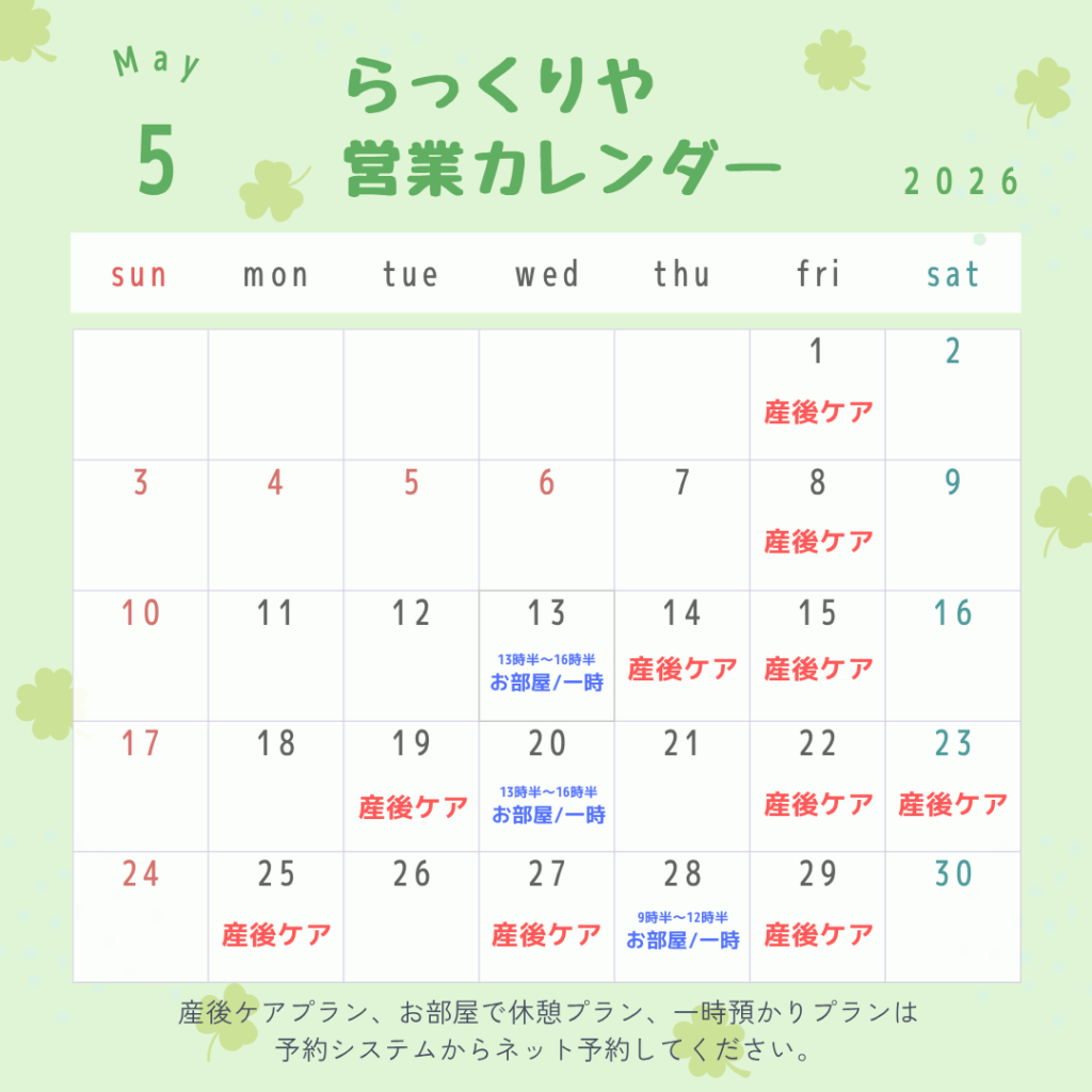 ホームお知らせ 5月のサービス予約開始しました! 2026年4月20日 5月の営業カレンダーをお知らせします。 産後ケアプラン、お部屋で休憩プラン、一時預かりプランのご予約は下のボタンからよろしくお願いいたします。 ご予約はこちらから くわしいサービス内容については「サービス内容」のページをご覧ください。 ご利用お待ちしています!
