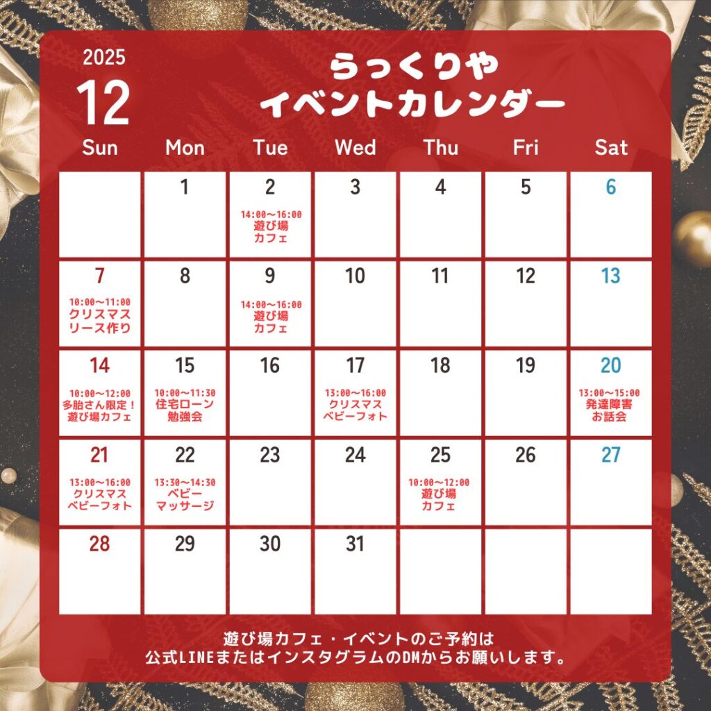 らっくりやの施設で自由に遊べます。お子様の体重測定や保健師への相談などもできます。12月はクリスマス特別企画もあるのでお楽しみに!