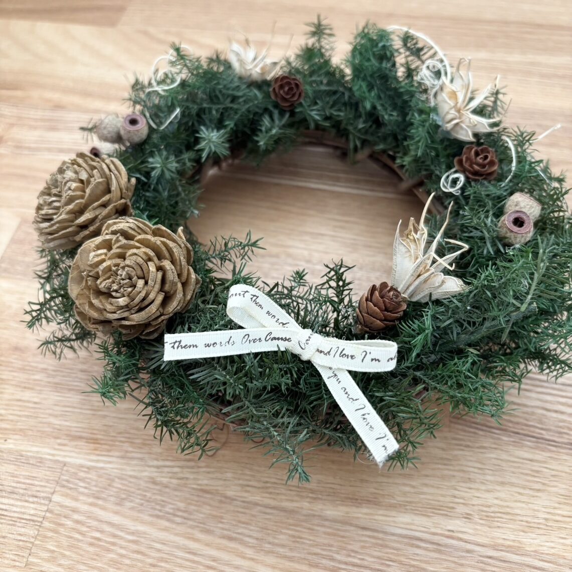 講師の松田さんは子育て交流ぽーとteteの一員で、看護師さんでもあります。ボンドで飾りをつけていくだけの簡単リース作り!直径16~17㎝のリースに自由に飾りを選んでつけられます。自分好みの特別なクリスマスリースを作りましょう~!